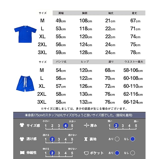 サイズ:【トップス】肩幅/バスト/袖丈/着丈(cm) (M) 49/108/21/67 (L) 53/118/22/71 (XL) 55/120/22/74 (2XL) 56/124/24/75 (3XL) 59/128/24/78 【パンツ】パンツ丈/ヒップ/渡り/ウエスト(cm) (M) 54/120/68/58-106 (L) 56/122/70/60-108 (XL) 57/126/72/60-110 (2XL) 58/130/76/62-116 (3XL) 58/132/76/66-124 ※寸法は平置きにて計測し、若干の誤差がある場合がございます。