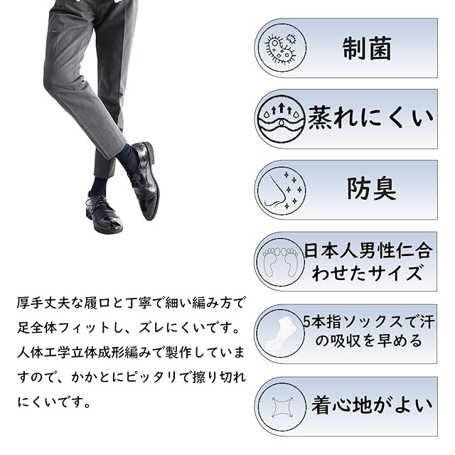 【適応範囲】ビジネス、外仕事などにだけでなく、遠足、登山、トレッキング、ゴルフ、ランニング、ハイキング、クライミング、日常生活にご利用頂ける5本指ビジネスソックスです。自分用はもちろん、家族や友人へのプレゼントにもおすすめです。