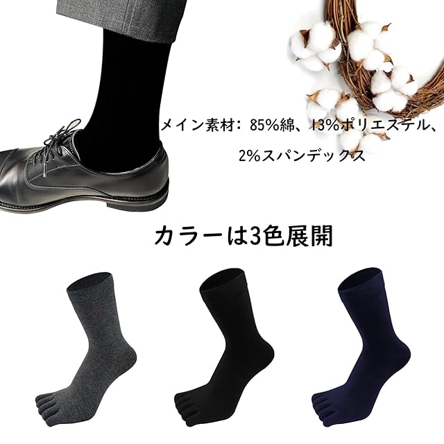 【蒸れない素材】主にコーマ綿と吸湿発散性のある合成繊維の混合物でできており、柔らかさ、耐久性、吸湿性に優れており、指の間に縫い目がな、生地 が ぶ厚すぎず 薄すぎず 履き心地も良いです、程良い弾力性で締め付けが優しくて、一日履いでもむくまなく、疲れが溜めない履き心地です。