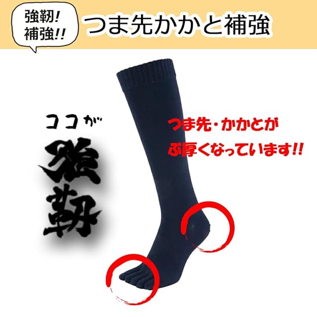 足底と足首にゴムサポートが入っており、しっかりフィット。激しい動きに対してもズレたり、靴の中で回転したりすることはありません。摩擦強度向上のための、つま先とかかとを強靭補強モデルです。