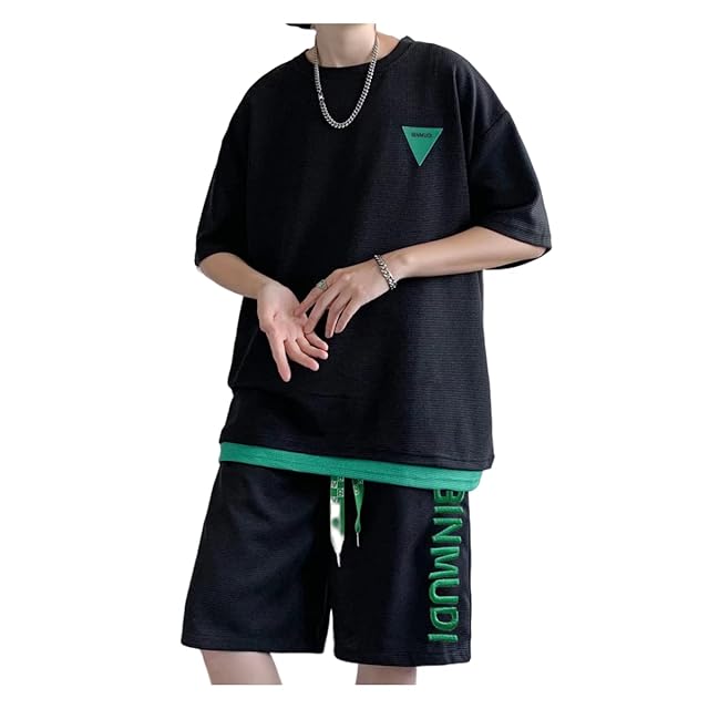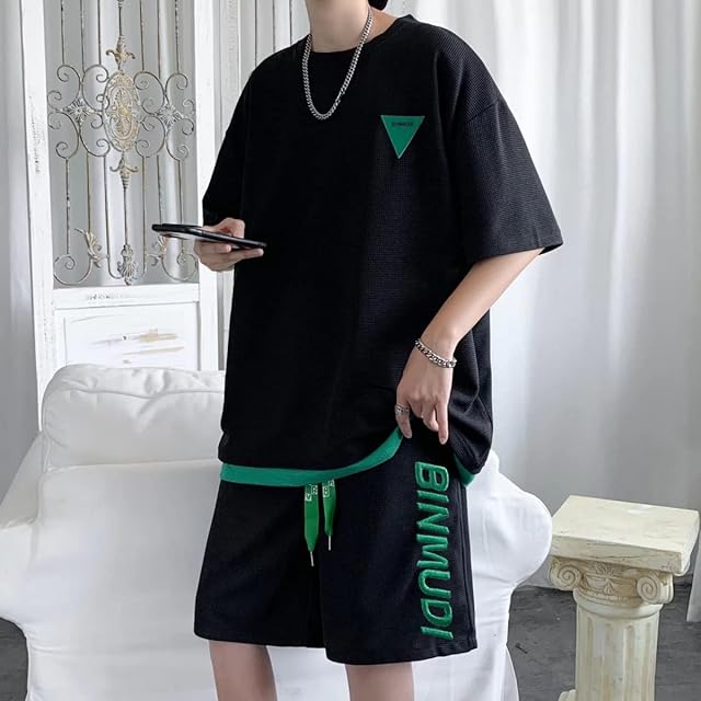 [CALEBGAR] ルームウェア メンズ 半袖 上下 夏服 ジャージ メンズ 上下セット ワッフル素材 部屋着 tシャツ ハーフパンツ 通気 吸汗速乾 トレーニングウェア ランニングウェア セットアップ おしゃれ (ブラック, L)