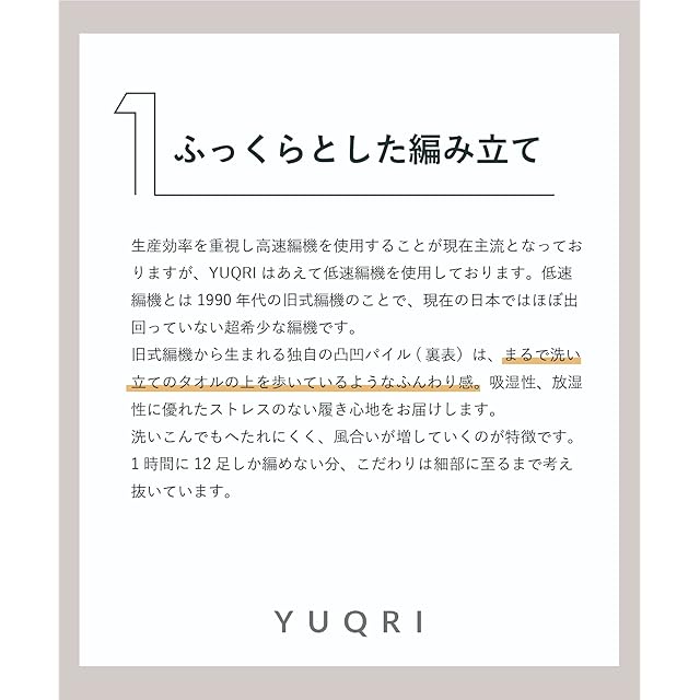 2021年スタートの靴下専門ブランド「YUQRI(ユクリ)」 ゆっくり。“慌てず、時間をかけて、丁寧に。" そこから生まれる上質で豊かなものづくりは、心地よく纏えるもの。 ゆくりなく。"予想もしない、新しい出会い。" 今までにない、革新的で新しい技術を取り込んだもの。 日常に寄り添うものだからこそ、心地よいものがいい。永く纏えるものがいい。安心できるものがいい。 私達が想うものを、ゆっくりと、ゆくりなく表現します。