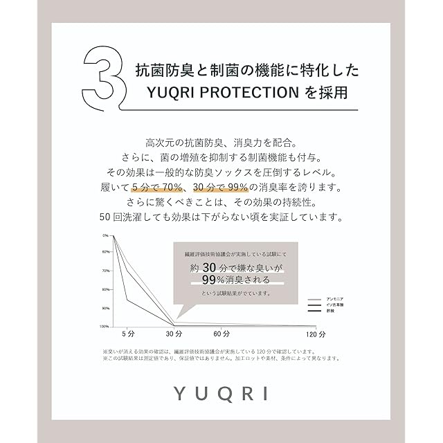 抗菌防臭・消臭・制菌を兼ね備えたYUQRI PROTECTIONを配合 高次元の抗菌防臭、消臭力を配合。さらに、菌の増殖を抑制する制菌機能も付与。 その効果は一般的な防臭ソックスを圧倒するレベル。 履いて5分で70%、30分で99%の消臭率を誇ります。 さらに驚くべきことは、その効果の持続性。50回洗濯しても効果は下がらないことを実証しています。 (SEKマーク取得済)