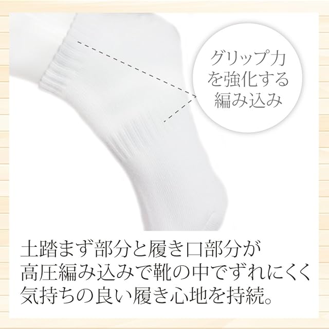 土踏まず部分と履き口部分が高圧編み込みで靴の中でずれにくく気持ちの良い履き心地を持続。