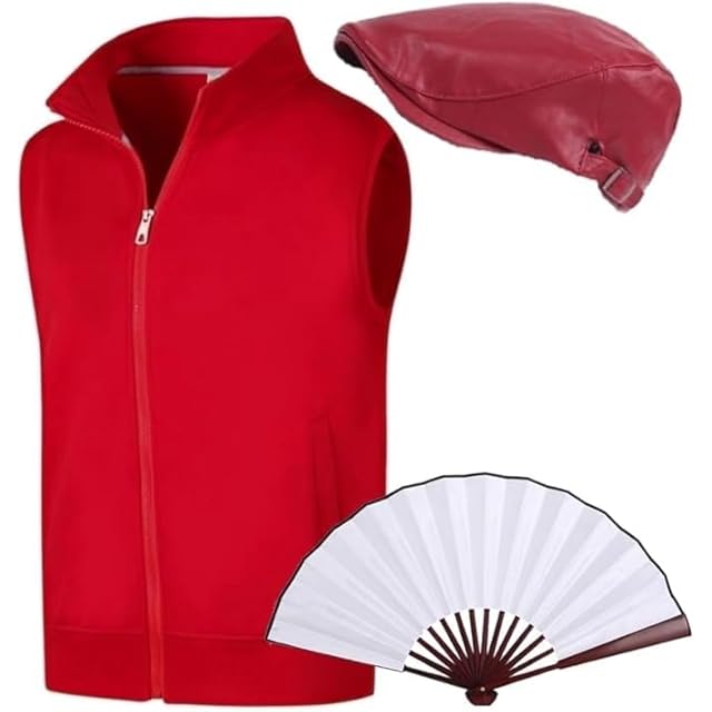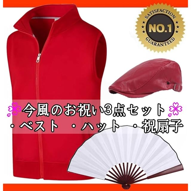 人生これから!まだまだ若い満60歳の還暦を迎える方へのお祝い、おしゃれなちゃんちゃんこセットです。 【セット内容】赤いちゃんちゃんこ風ベスト、頭巾風の合皮ハンチングハット、祝扇の3点セットです。