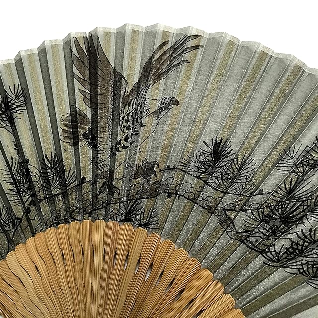 老松に鷹柄の和柄シルク扇子です、落ち着いた色合いでシックな雰囲気が特徴です。
