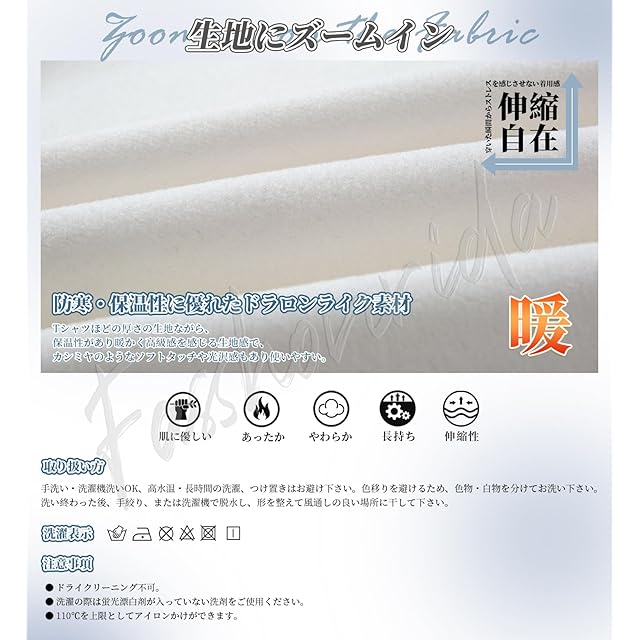 表が起毛になっているのでとてもふんわりとして気持ちのいい肌触りのドラロンライク素材。Tシャツほどの厚さの生地ながら、保温性があり暖かく高級感を感じる生地感で、カシミヤのようなソフトタッチや光沢感もあり使いやすい。ポリウレタン入りでとてもよく伸びます!熱を逃がさず、1枚着用するだけで、通常のTシャツの数倍の暖かさ。