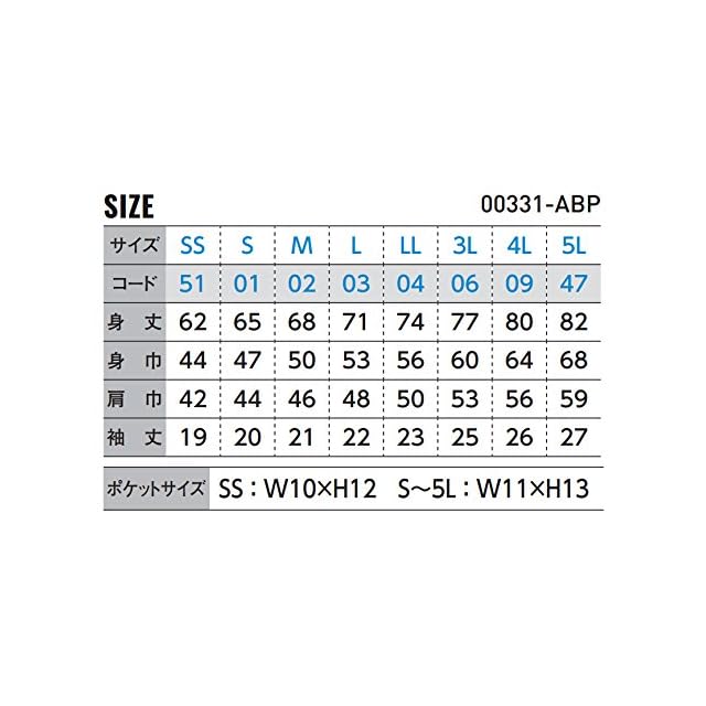 SIZE:5L 肩幅:59cm 袖丈:27cm 身幅:67.5cm 着丈:79cm SIZE:L 肩幅:46.5cm 袖丈:20.5cm 身幅:52cm 着丈:67.5cm SIZE:LL 肩幅:48.5cm 袖丈:22cm 身幅:56.5cm 着丈:72cm SIZE:M 肩幅:46cm 袖丈:20.5cm 身幅:50.5cm 着丈:66cm SIZE:S 肩幅:44cm 袖丈:19.5cm 身幅:46.5cm 着丈:62.5cm SIZE:SS 肩幅:41cm 袖丈:18.5cm 身幅:45.5cm 着丈:59cm