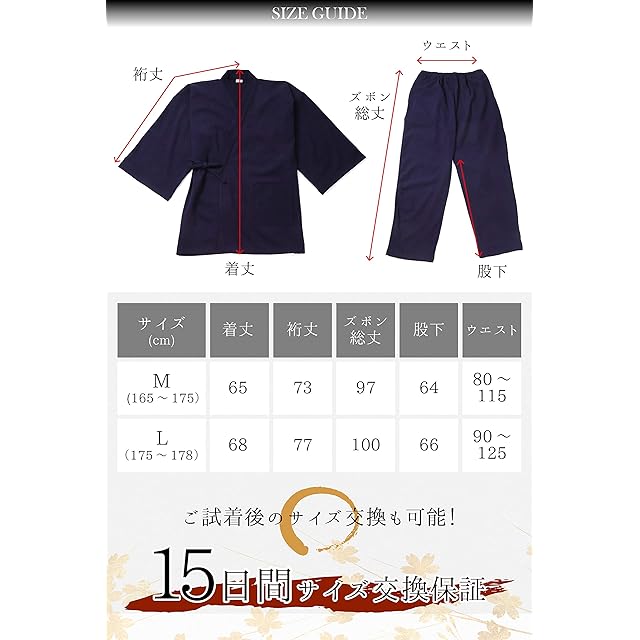 【サイズ】S~Lサイズまで揃えております。【Sサイズ】身長・・155cm~165cm 着丈・・62cm 裄丈・・70cm ズボン総丈・・95 股下・・62 ウエスト・・65~90 【Mサイズ】身長・・165cm~175cm 着丈・・65cm 裄丈・・73cm ズボン総丈・・97 股下・・64 ウエスト・・80~115 【Lサイズ】身長・・175cm~180cm 着丈・・68cm 裄丈・・77cm ズボン総丈・・100 股下・・66 ウエスト・・90~125