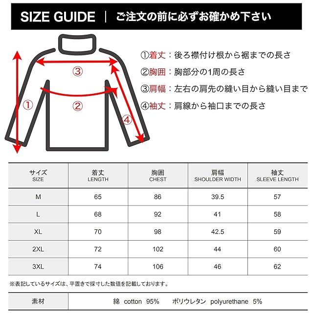 [着丈] Mサイズ : 65cm , Lサイズ : 68cm , XLサイズ : 70cm , 2XLサイズ : 72cm , 3XLサイズ : 74cm