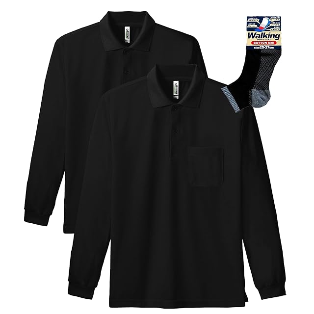 glimmer ロングスリーブ ドライポロシャツ ポケット付 2枚組 Sportsソックスセット ブラック LL