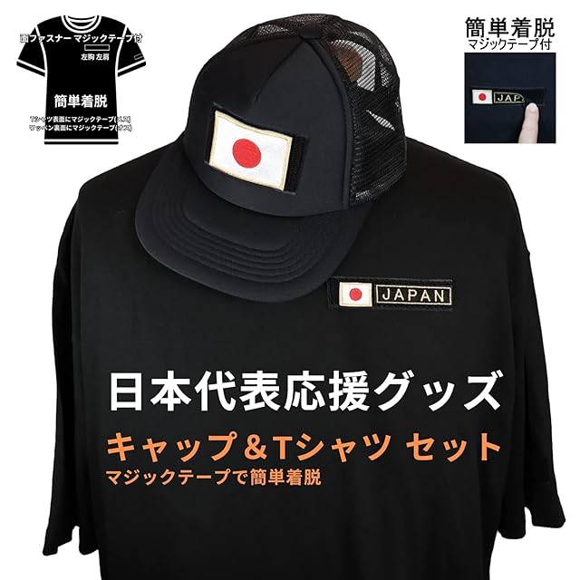日本代表 応援グッズ キャップ Tシャツ Lサイズ セット ブラック 半袖 綿100% 日の丸 S + SSS ゴールド + JAPAN ブラック ワッペン 3枚セット メンズ レディース 男女兼用 夏 海 アウトドア イベント キャンプに最適 t-shirt-cap-japan-bg