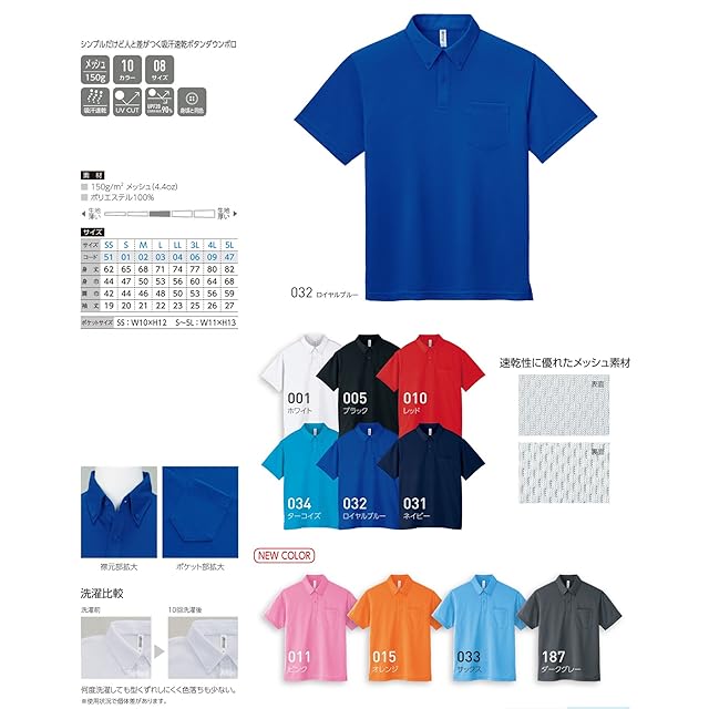 素材構成: ポリエステル100% 吸汗速乾 UVカット UPF20 遮蔽率90%
