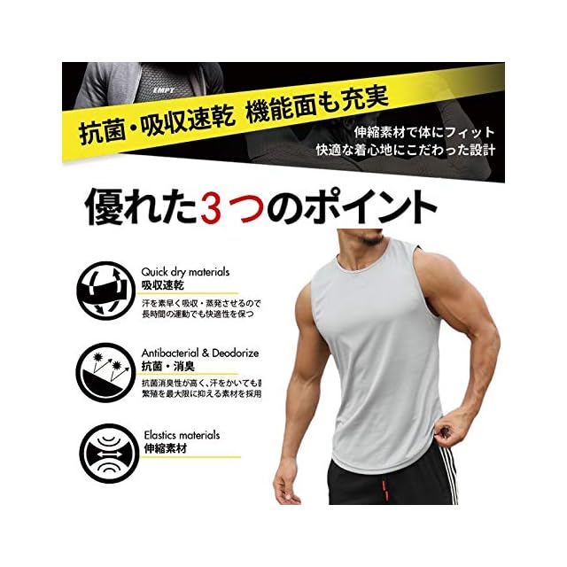 【タンクトップ メンズ - 通気性抜群】通気性の良い速乾・高吸収素材で熱と汗を素早く吸収し、放出してくれます。激しい運動の後もさらっとした着心地。