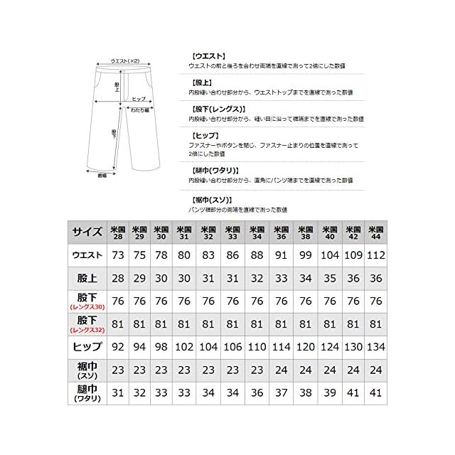 サイズ:W44L30(ウエスト:110cm、股上:37cm、股下:76cm、裾幅:24cm、ワタリ幅:39cm)