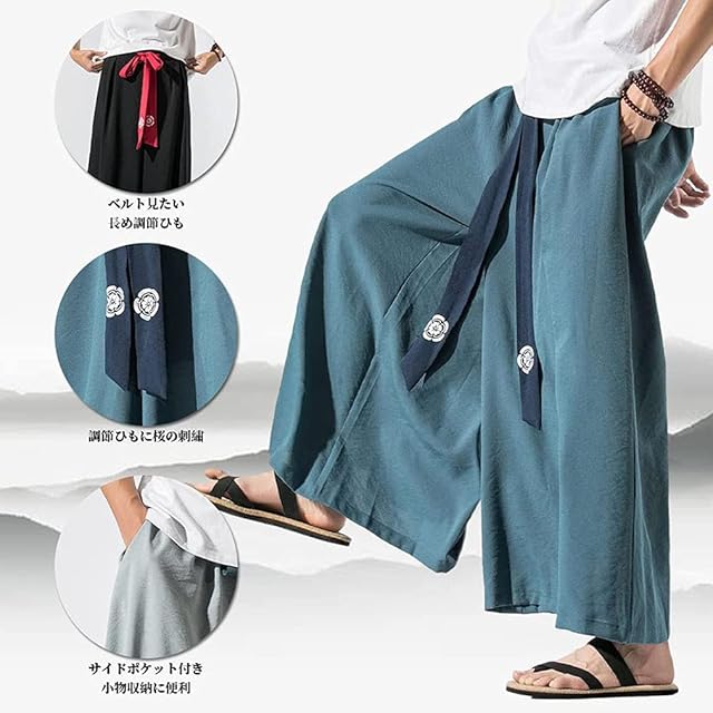 [BARYPORY] ワイドパンツ 袴パンツ 和式ズボン メンズ ガチョウパンツ ゆったり ベルト付き 和柄 無地 サルエル ビッグシルエット衣装 大きいサイズ ルームウェア オールシーズン ゆるゆる 男女兼用 (L, ブルー)