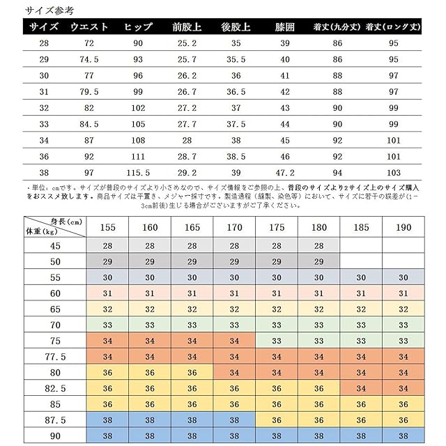 2つの丈:九分丈-短めアンクル丈、ロング丈-ちょい長アンクル丈、サイズ:28、29、30、31、32、33、34、36、38 単位:cmです。サイズが普段のサイズより小さめなので、サイズ情報をご参照の上、2サイズ上のサイズ購入をおススメ致します。詳しいサイズ情報が写真の最後一枚でご参考ください。