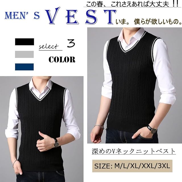 Wowcarbazole ニットベスト メンズ Vネック セーターベスト ビジネス 綿 無地 スクールベスト カジュアル 春夏秋冬 ブラック2 (WJP0003B2-M)