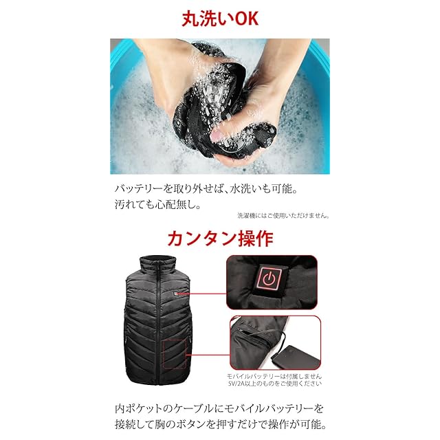 丸洗いOK:バッテリーを取り外せば、水洗いも可能。汚れても心配無し。 ※洗濯機にはご使用いただけません。