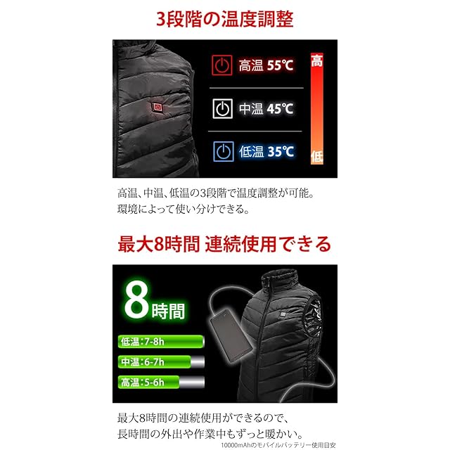 最大8時間 連続使用できる:最大8時間の連続使用ができるので、長時間の外出や作業中もずっと暖かい。 ※10000mAhのモバイルバッテリー使用目安
