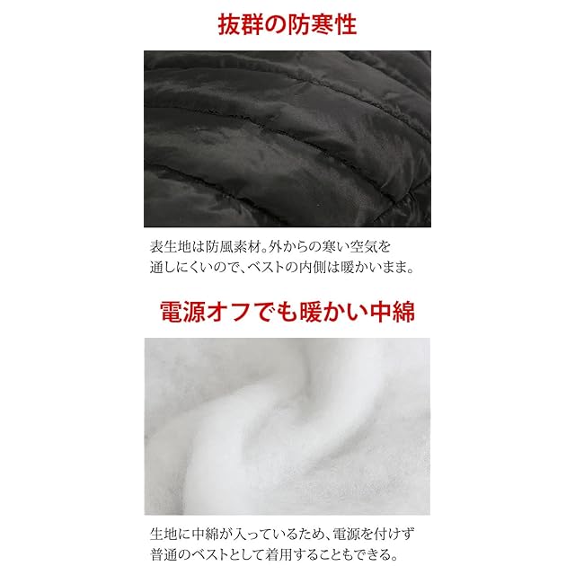 電源オフでも暖かい中綿:生地に中綿が入っているため、電源を付けず普通のベストとして着用することもできる。