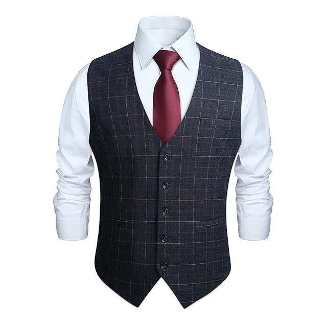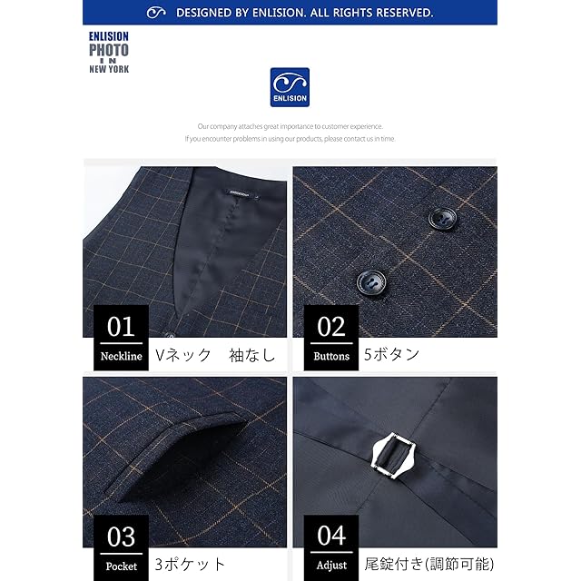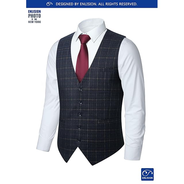 [Enlision] スーツベスト メンズ ネイビー チェック柄 結婚式ベスト おしゃれ フォーマル カジュアル ビジネス 紳士 礼服 Vネック 5ボタン 2ポケット おおきいサイズ サイズM VC-01