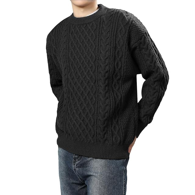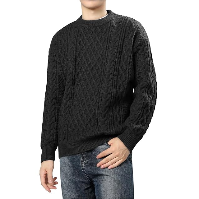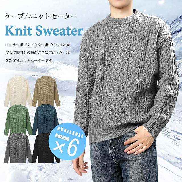 [ミラーユー] セーター メンズ ケーブルニット クルーネック 長袖 伸縮性 保温 無地 カジュアル 秋冬 (ブラック)