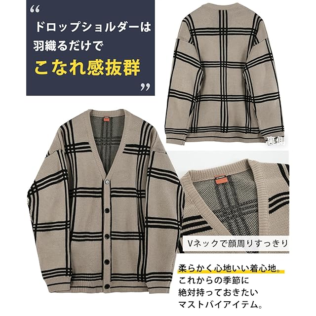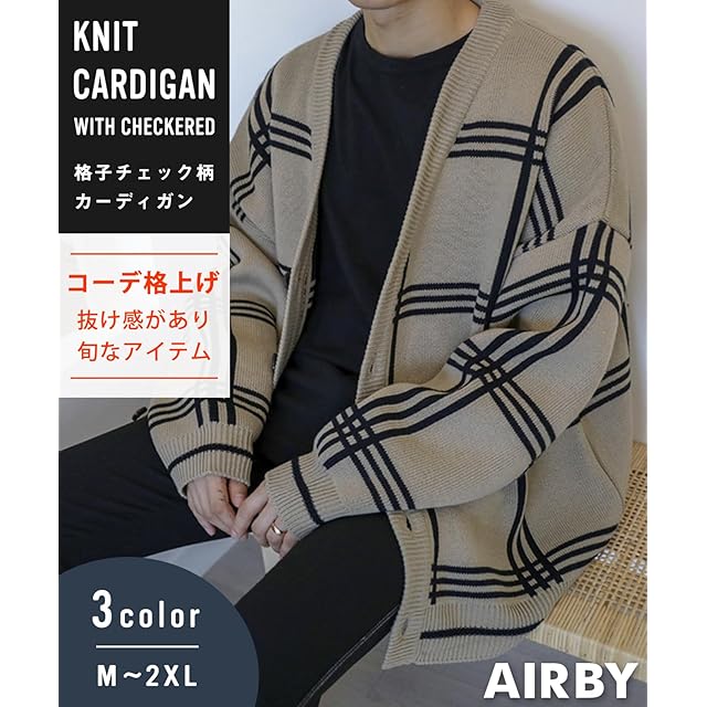 [エアバイ] チェック 柄 ニット カーディガン ソフトタッチ ゆったり Vネック 長袖 秋 冬 メンズ vネック ウィンター レイヤード ライト ビックニット ビッグシルエット オーバーサイズ アメカジ スクールセーター スポーツ キャンプ サバゲー パジャマ ビジネス トレーニング ストリート クラシック 軽量 厚手 防寒 韓国 韓国風 通学 登山 作業 作業着 ブラック 3A-A14-BKM