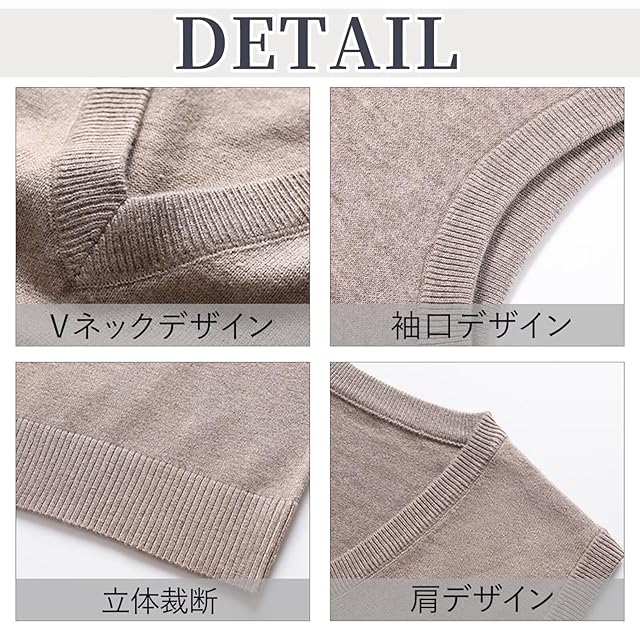 「高い品質」このニットベストは厳選したウール素材を使用し、ポリエステルと混紡することで、柔らかい肌触りと暖かい保温性を実現しました。型崩れしにくい抜群の生地感と優れた形態安定性を持つ、毛玉もできにくく、シルエットが変わらず長く愛用することができるメンズベストです。