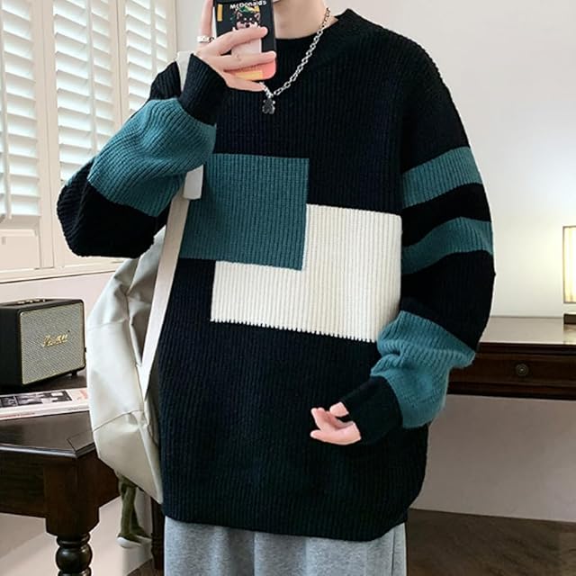 [GUTHONG] セーター メンズ 冬服 ニットセーター ハーフタートルネック 長袖 カラーマッチング 厚手 防寒 暖かい 大きいサイズ カジュアル パッチワーク セーター メンズ 春秋冬 トップス black 2XL