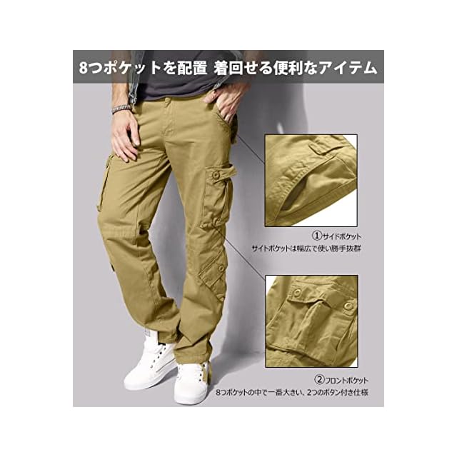 「実用性」リラックスフィットのちのカーゴパンツで、ポケットが付き、実用的なカーゴパンツです。