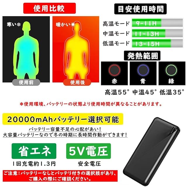 【20000mAh大容量バッテリー付き最大15H使用・USB給電】*ご注意:バッテリーなしとバッテリー付きの選択肢があり、ご購入の際にちゃんとご確認ください。*USB加熱式で、ポケット内のUSBケーブルで電源に接続しながら使用する男女兼用ヒートベストです。付属の20000mAhモバイルバッテリーを使うと、高温で9-11H、中温で11-13H、低温で13-15Hと長持ち。メンズ、レディースを問わず、冬場で外出する方、工事現場、警備、農作業などお仕事で屋外作業が多い方に適用。放射線なしで、安定した発熱により感電する心配もなく安心着用できます。汚れたら、バッテリーを外して、手洗いや洗濯機でも洗えます。