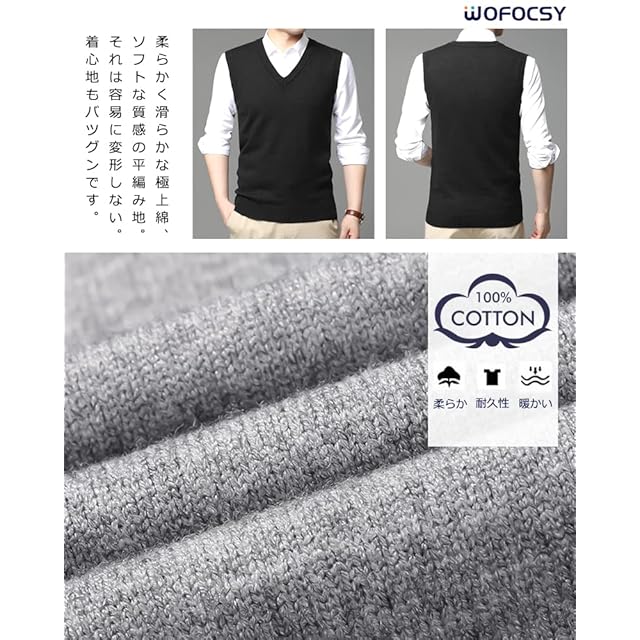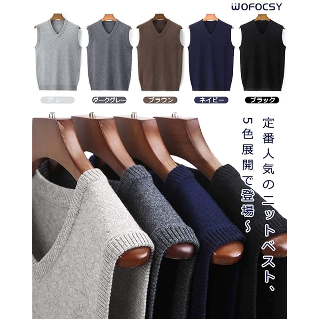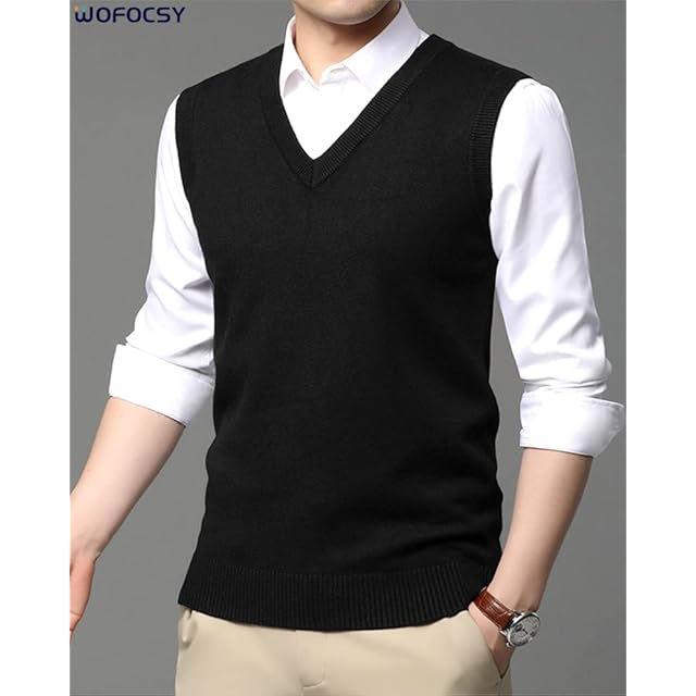 WOFOCSY メンズ ニット ベスト 秋冬 セーター 無地 ファッション シンプル vネック SY141 (L, ブラック)