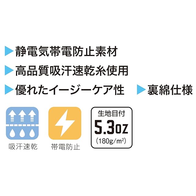 静電気帯電防止素材使用、高品質吸汗速乾糸使用、裏綿仕様