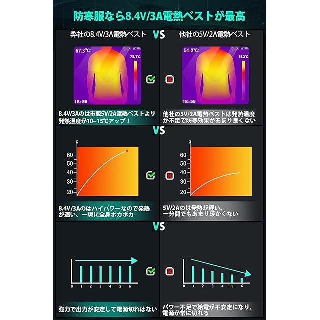 【バッテリー進化・世界初の9V/3Aハイパワーバッテリー】この業界最強の電熱ベスト専用の9V/3Aハイパワーバッテリーにより、圧倒的な発熱温度と発熱速度を実現できるのはもちろん、5V/2Aのバッテリーが使用中電源切れとなるという問題も徹底的に解決しました。電源入れて2秒で全身ポカポカ、5V/2Aのバッテリーよりヒーターベストの発熱温度も10~15℃アップ!また、5V/2Aのバッテリーは出力不足で電源が常に切れますが、この専用バッテリーは9V/3Aハイパワーで出力安定して電源切れにならないので、電熱ウェアに最適です。