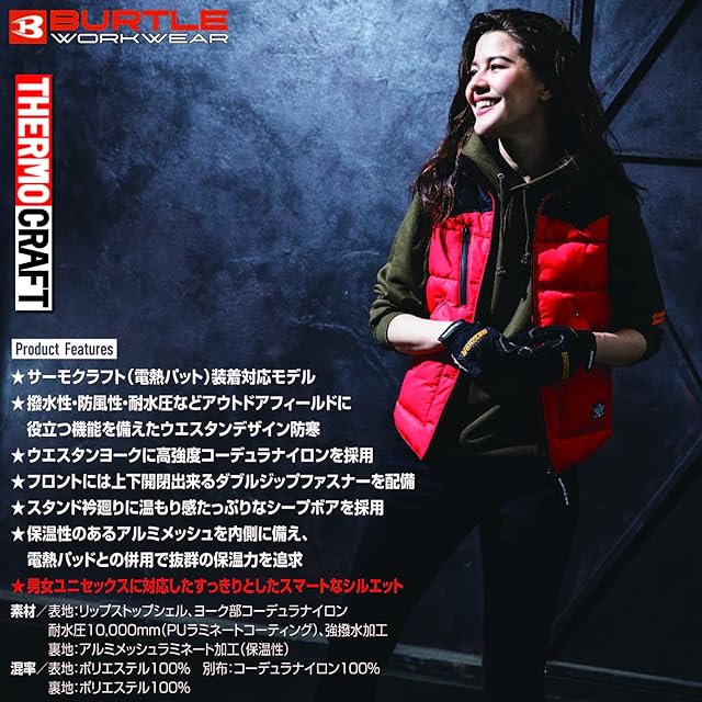 バートル5024のヒーターベスト。サーモクラフト(電熱パッド)装着対応モデル。防風・防水・撥水機能を備えたマイクロドビー素材(耐水圧10,000mm)。高強度コーデュラナイロン素材を採用。フロントファスナーダブルジップ仕様。裏地アルミメッシュによる保温性。男女兼用。