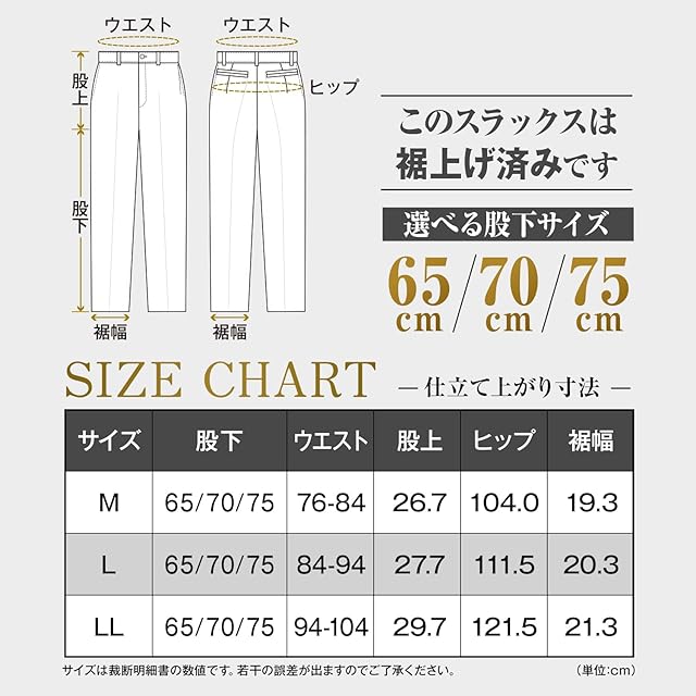 選べる股下(L65=股下65cm、L70=股下70cm、L75=股下75cm)