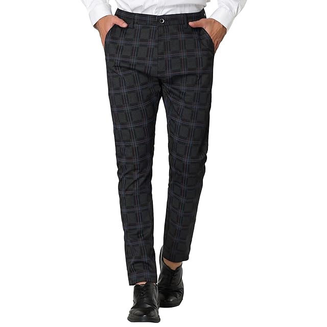 スリムフィット、ボタンフロントにジッパーフライクロージャー、クラシックなチェック柄ドレスパンツ。