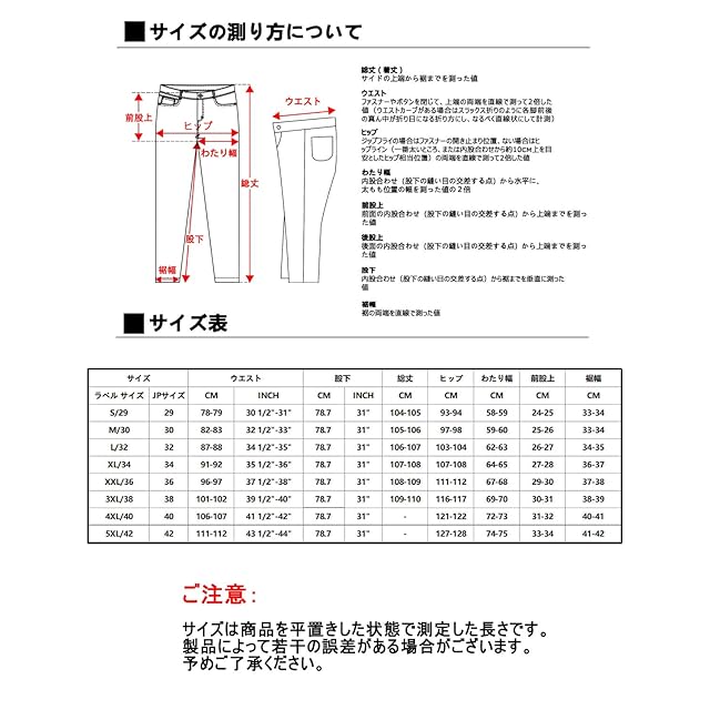 ♚サイズ詳細:2XL/36」ウエスト97股上29股下79ワタリ67ヒップ112裾周り37;「3XL/38」ウエスト102股上30股下79ワタリ70ヒップ117裾周り39;「4XL/40」ウエスト107股上32股下79ワタリ72ヒップ122裾周り40;「5XL/42」ウエスト112股上33股下79ワタリ73ヒップ127裾周り41。