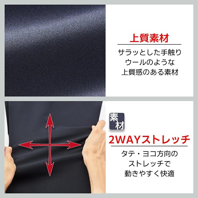 【縦横ストレッチで快適な履き心地】通常の横伸びストレッチに加え、縦方向にも自然に伸びる2WAYストレッチ素材を使用。軽くて耐久性に優れた高機能ポリエステルなので、立ったり、座ったりなどの着用シーン、アクティブな動きにも対応できて快適にサポート