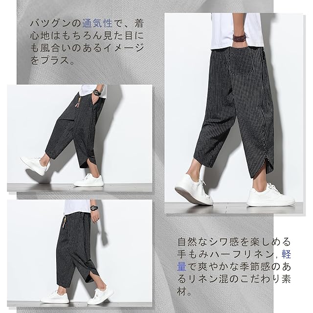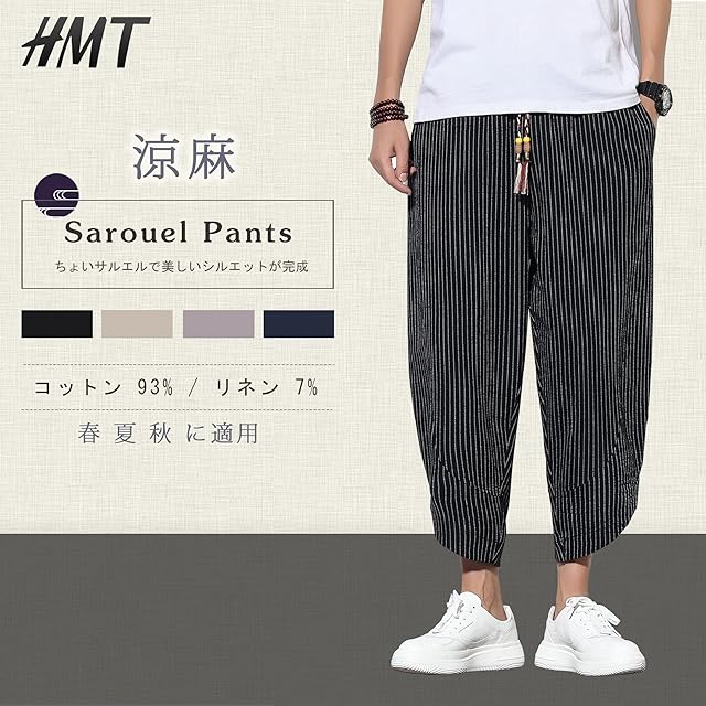【1】接触冷感・吸汗速乾・ストレッチ性に優れたメンズサルエルパンツが新登場!軽量で爽やかな季節感のあるリネン混のこだわり素材。綿麻特有の通気性で、夏でも快適にサラッと肌あたりがよく涼しげなリネンと、フィットし過ぎないシルエットとサラッとした接触冷感素材の効果で暑い日でも快適な穿き心地です。