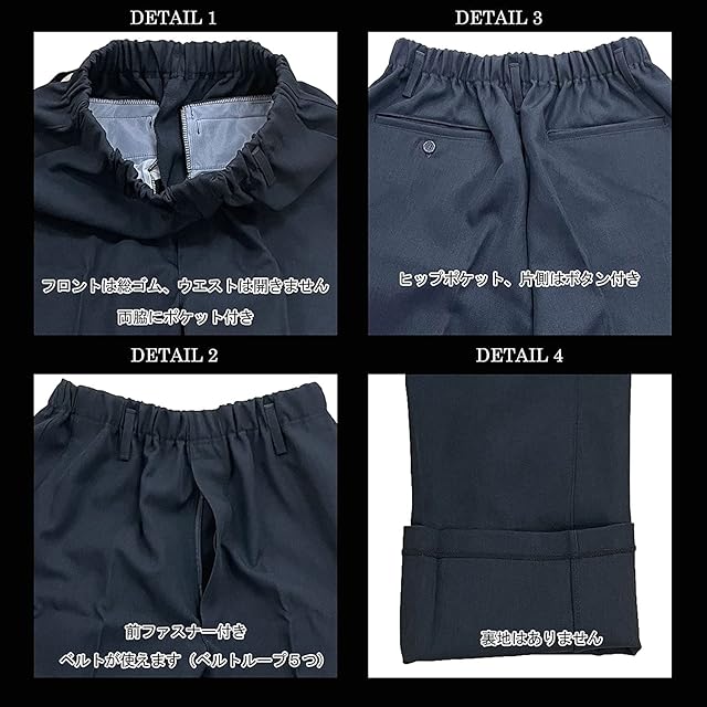 ベルト通し有り、前ファスナー有り ウエスト総ゴム(ウエストは開きません)