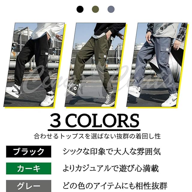 【コーディネートしやすい定番の3色】[ブラック]シックな印象で大人な雰囲気 [カーキ]よりカジュアルで遊び心満載 [グレー]どの色のアイテムにも相性抜群 どの色も合わせるトップスを選ばない万能のアイテムです。