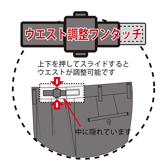 【ウエストサイズが調整できるアジャスター付】ウエストサイズをワンタッチで調整できるアジャスター機能付き。片側で±2.0cm、両側で±4cm調整出来るので、お好みのフィット感がご着用いただけます。