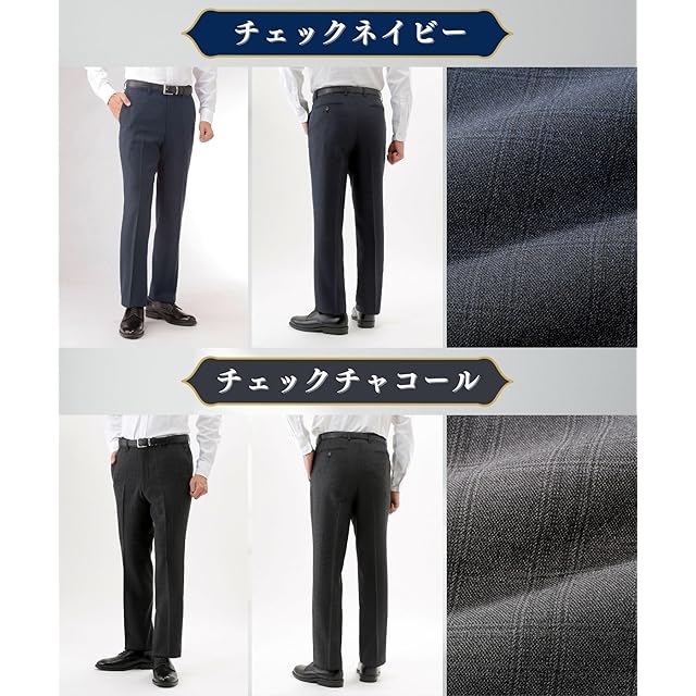 【オールシーズン対応】ビジネスからカジュアルまで対応する、すっきりシルエットのノータックスラックス。さりげないチェック柄のウールライク素材は季節を選ばすオールシーズン着用できます。