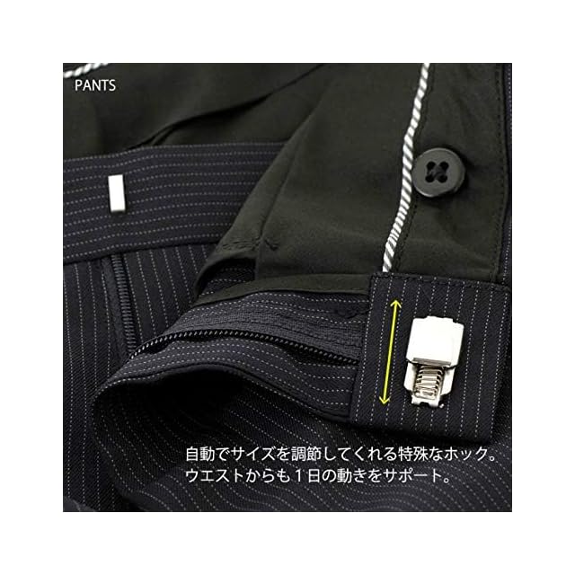 パンツウエスト部に自動でサイズを調整してくれる特殊なホックを採用。食事の後、座る時などお腹まわりがきちくなった時、ホックが緩む機能なのでらくらく。ウエスト部からも1日の動きをサポート。
