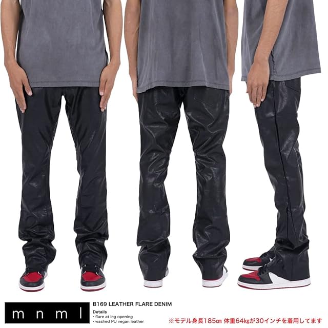 【美シルエットでブーツカットが魅力的なフレアパンツ】 mnml ミニマル から展開する「B169 LEATHER FLARE DENIM」。シンプルかつモダンなデザインを得意とするミニマル。ブーツカットが魅力のレザーパンツが登場。ボディにPUレザー生地を使用したインパクト抜群なレザーパンツ。美脚シルエットで脚長効果もあり♪ ※モデル185cm体重64kgが30inchを着用しています。