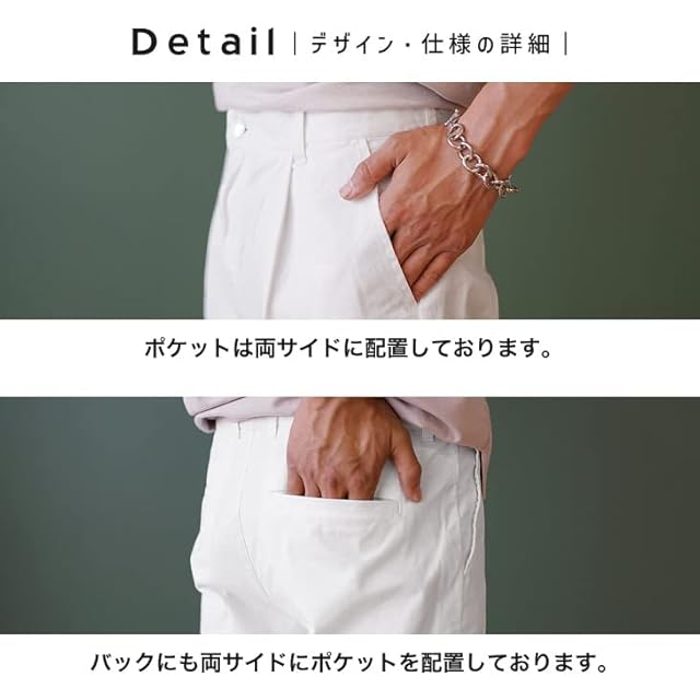 ●Fabric/生地感 コットンとポリウレタンを使用しており、 チノパンの様なしっかりした生地感です。 オフホワイトのみ、 インナーが濃色の場合やや透け感があります。