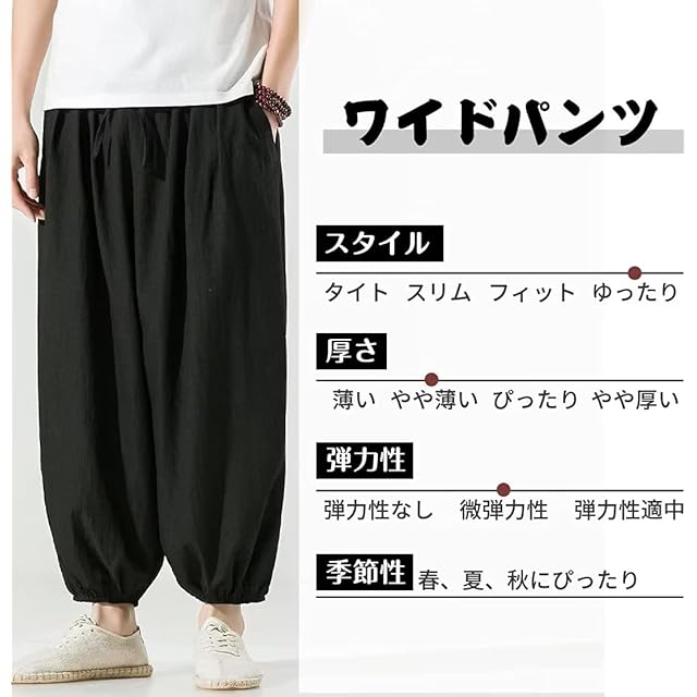 [UFNISAK] ワイドパンツ メンズ サルエルパンツ ガウチョパンツ 夏ズボン 夏用 ゆったり 袴 リネンパンツ 麻パンツ 涼しい ゴム紐調整 ルームウェア 綿麻感じ 九分丈 通気 男女兼用