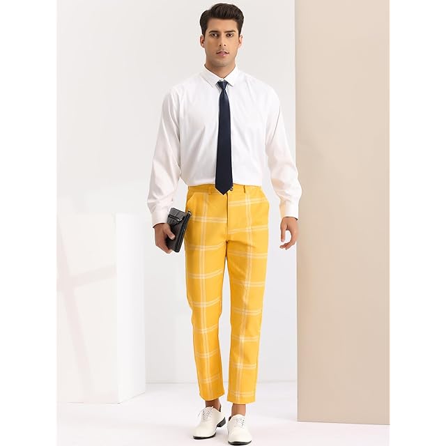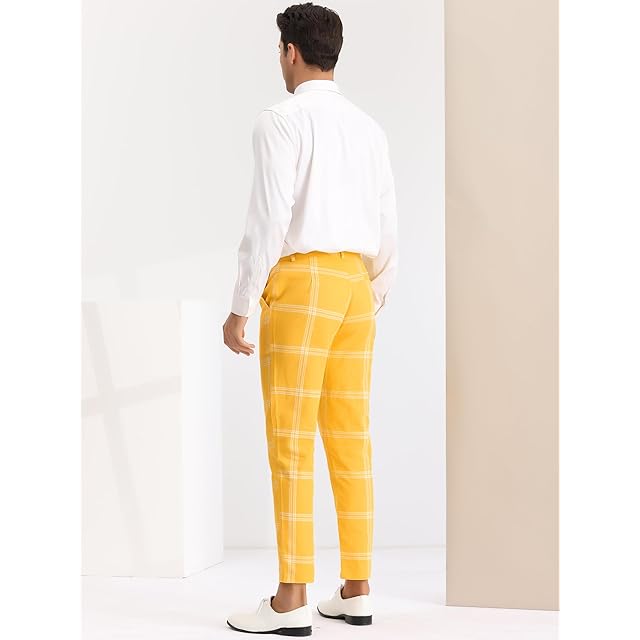 [Lars Amadeus] チェック柄 パンツ チェック ビジネス ロングパンツ カジュアル スリム メンズ イエロー 36